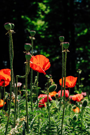 Generative AI : Wild papaver rhoeas or poppy flowers growing wild in the country