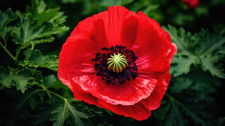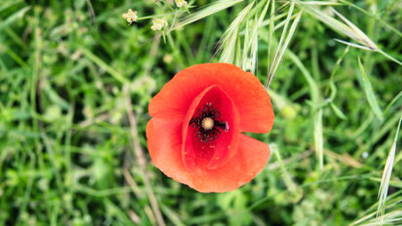 Single colorful red poppy in a corn field, meadow or garden viewed from above in sunlight against green foliage