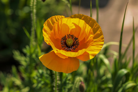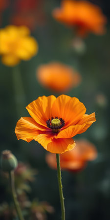 Bright orange poppy flower in a vibrant garden during the afternoon light with blurred background blooms