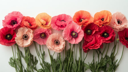 A vibrant array of delicate poppy flowers in shades of peach, pink, and cream lies on a white surface, perfect for showing spring beauty. The lush petals create a soft, inviting atmosphere.