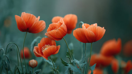 Beautiful orange poppies stand tall in a serene field, surrounded by soft green leaves, capturing the essence of nature's elegance under gentle light.