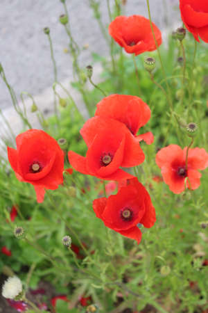 Vivid orange-red poppies growing in an urban location - almost wild - during the summer in England.