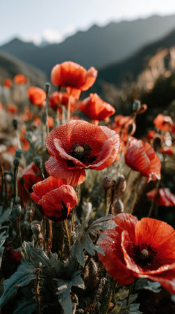 Bright red poppies bloom abundantly in a serene mountainous area, with early morning light illuminating their delicate petals. The beauty of nature is captured elegantly.