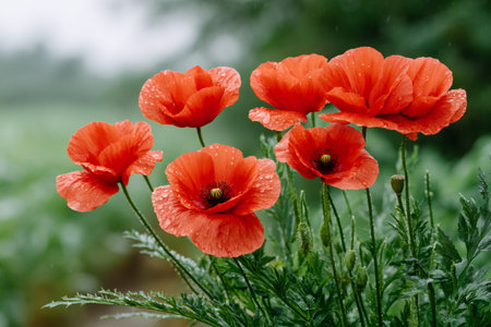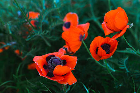 Beautiful red poppies with water drops blooming in the field after the rain