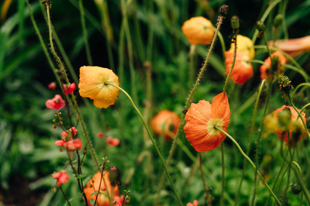 Vibrant poppy flowers bloom on a spring backyard. Vertical shot of mixed colors of plants in city park or botanical garden. Flora under the sun, creating a picturesque setting of nature