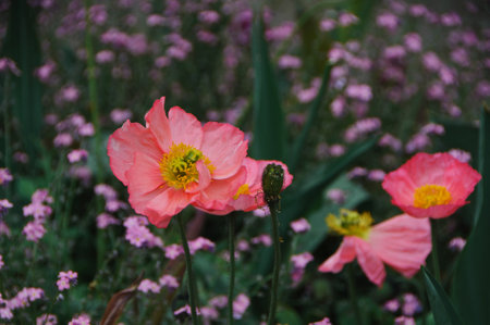 pink poppies in the garden, closeup of photo