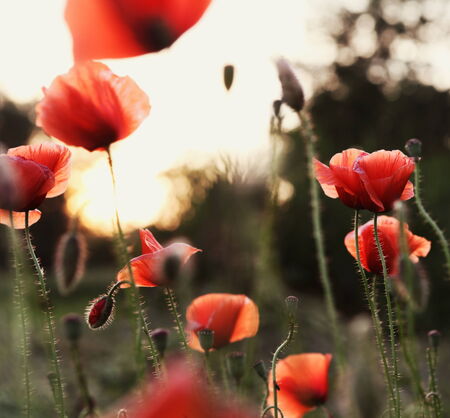 Red poppies in a field against a sunset background. Beautiful flower picture for content.