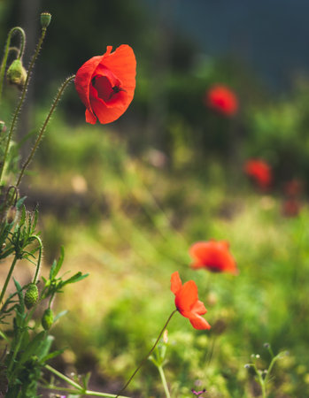poppy flowers in the meadow, vintage style, shallow depth of field
