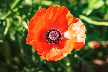 Inflorescence of red Decorative Poppy flower on the background of greenery in the flower garden on a Sunny spring day