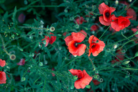 Poppies among the green foliage in the field, top view.