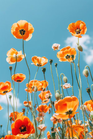 Vibrant orange flowers blooming against a bright blue sky, with soft clouds in the background creating a cheerful and lively atmosphere.