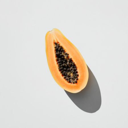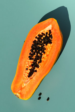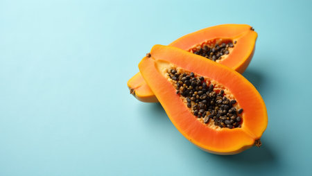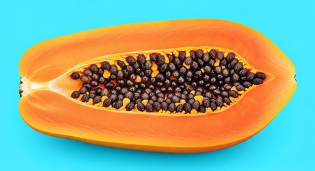 Fresh halved papaya with vibrant orange flesh and black seeds on light blue background