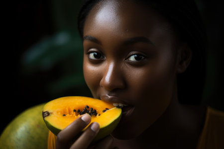 Portrait of a confident young woman biting into a fresh and juicy pawpaw fruit