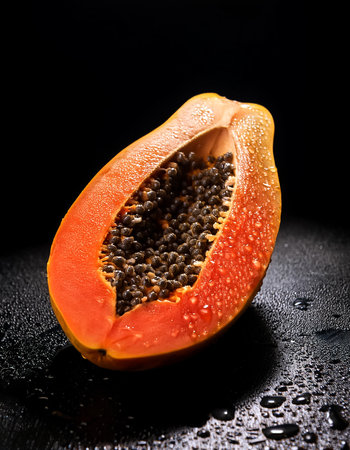 Juicy Hawaiian papaya on dark black background.