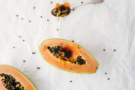 Half of ripe papaya fruit on white background, Remove seeds
