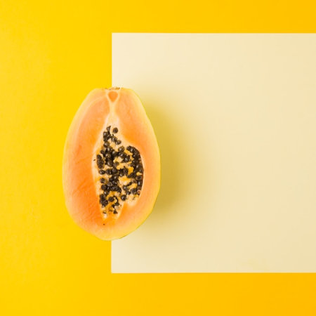 Half ripe papaya fruit with seeds on yellow background, copy space, flat lay