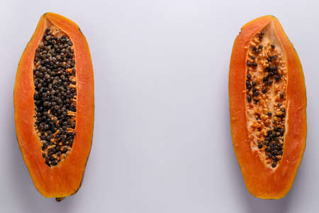 Two halves of ripe papaya on white background, horizontal orientation, copy space, top view