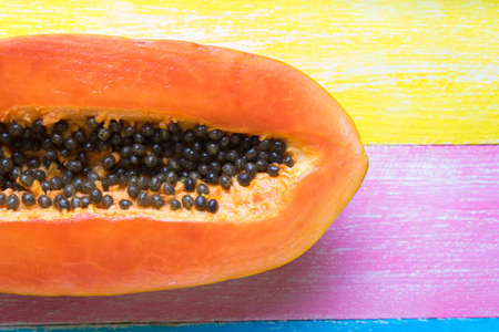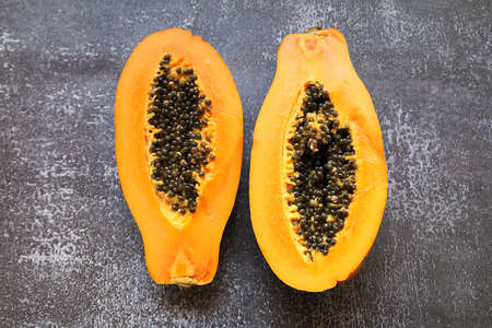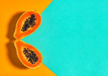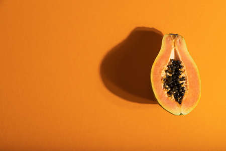 Papaya fruit on orange, yellow background. Half of fresh organic Papaya exotic fruit close up. Top view