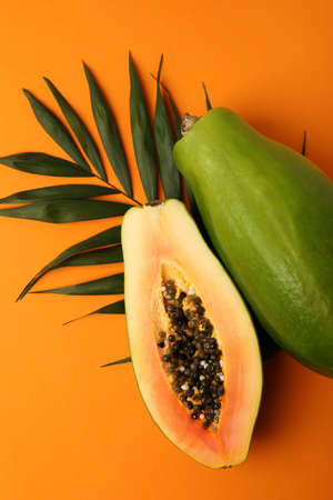 Ripe papaya with leaves on orange background