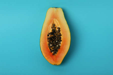 Half papaya on blue background. Copy space. Top view.