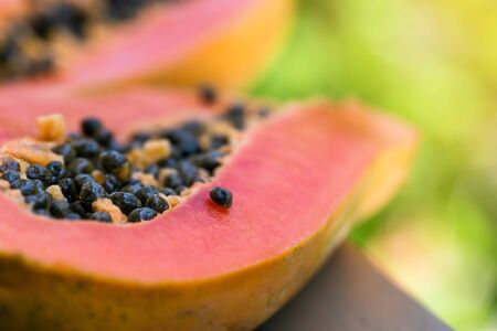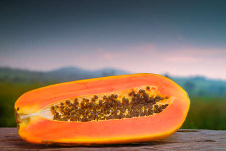 Half cut ripe papaya with seed onon old wooden table with nature background. Natural medicine
