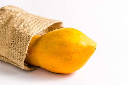 fresh yellow papaya with burlap bag isolated on white background