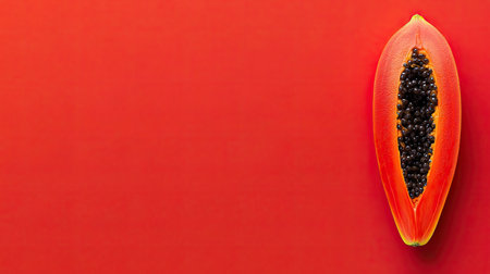 A vibrant image showcasing a fresh halved papaya with black seeds against a striking red background, highlighting its natural beauty and healthy appeal.