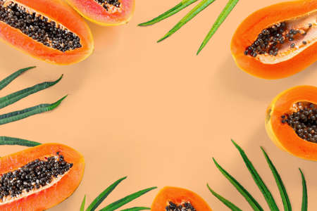 Border of papaya and leaves. Flat lay, copy space