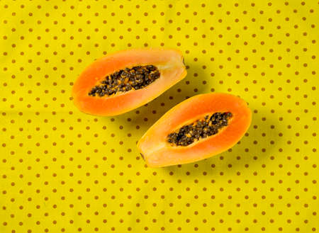 cross section of papaya isolated on yellow fabric background, top view.