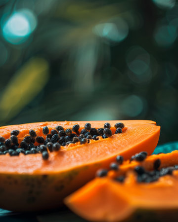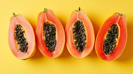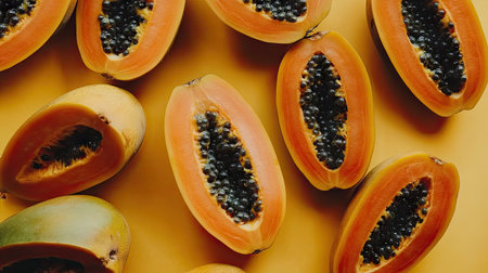 Bright orange papaya halves reveal black seeds, showing vivid colors in a beautiful arrangement.