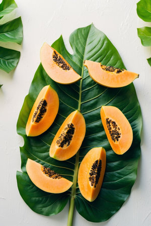 AI Generated. Fresh papaya slices on tropical leaf background