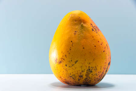 Fresh pink mango fruit on blue background. Fruit rich in fiber and source of protein. Natural food and detox. Ingredient for culinary juices and creams and salads.