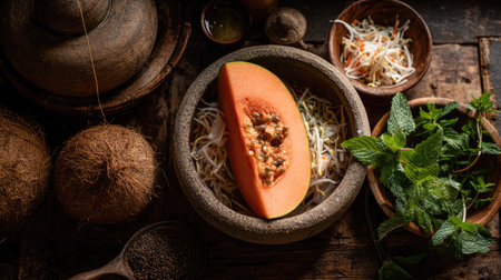 A vibrant sliced papaya served on a rustic wooden surface surrounded by fresh herbs and natural ingredients, perfect for culinary photography and healthy cooking inspiration.
