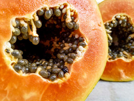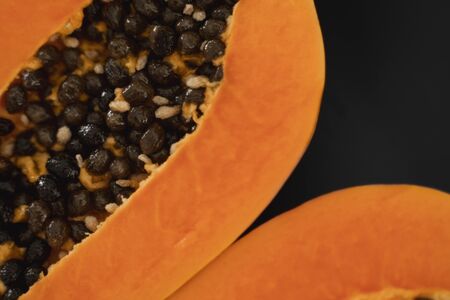 Macro photography to asliced orange fresh papaya with seeds inside. Fruit and texture concept
