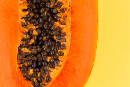Half of ripe papaya with seeds on yellow background