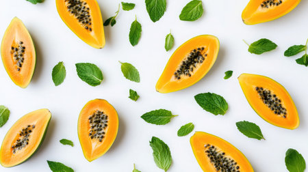 Brightly colored papaya slices arranged with fresh mint leaves on a clean white background, perfect for healthy cooking and vibrant food photography.