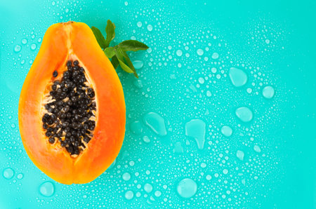 Papaya fruit on blue background with water drops, fresh exotic fruits border design. Half of fresh organic Papaya exotic fruit with leaf close up. Top view