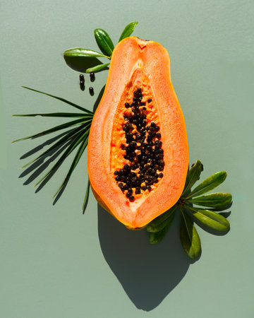 Papaya fruit over green background, half of fresh exotic fruits with seeds. Halved fresh organic Papaya exotic fruit art design, close up. Top view, flat lay, vertical image