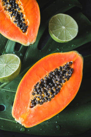 A flat lay image showing a ripe papaya cut in half and a fresh lime placed on a large tropical leaf