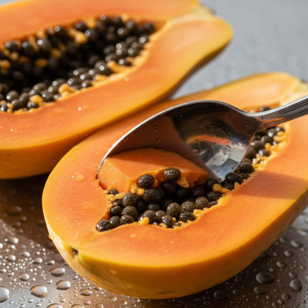 Vivid papaya halves reveal glossy black seeds and bright orange flesh. A reflective spoon rests on the fruit, suggesting a fresh tropical snack or healthy breakfast ingredient. Ideal for recipes and nutrition themes.