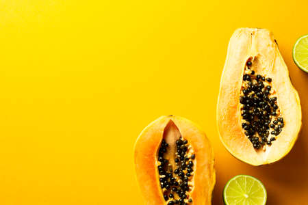 Sliced fresh and tasty papaya and green lime on a yellow background. Tropical fruit. Copy space.