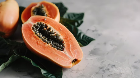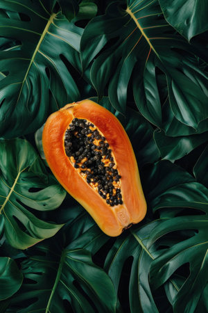 Fresh papaya cut in half, revealing black seeds, placed on lush green tropical leaves. Vibrant colors reflect tropical fruit concept.