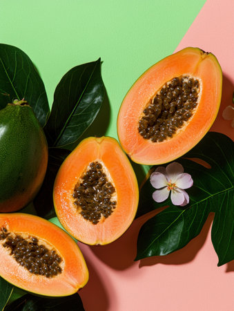Fresh ripe papaya halves with tropical leaves on a pastel background