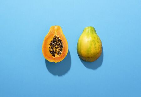 Halved papaya on blue background. Top view. Copy space. Summer time. Tropical travel, exotic fruit. Vegan and vegetarian concept.