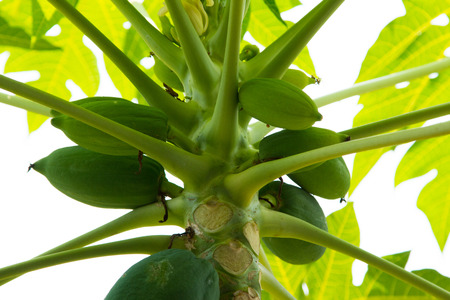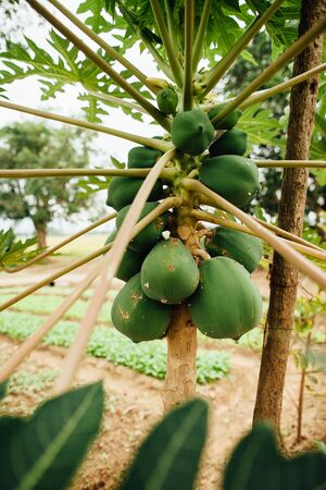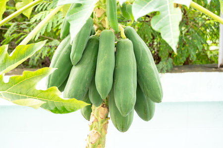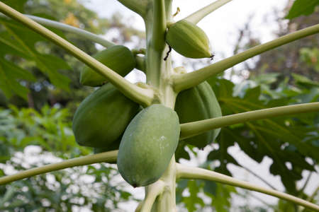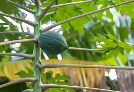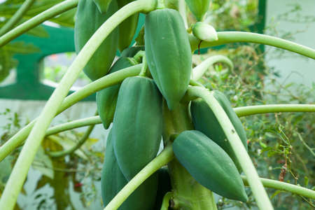 green papaya, fresh papaya on the tree. Planted in the garden in the house.