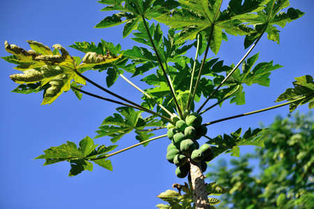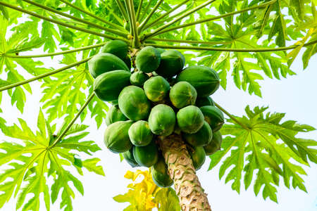 Papaya tree with green leaves and ripe fruits. High quality photo