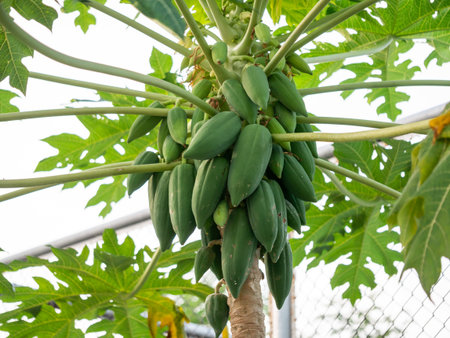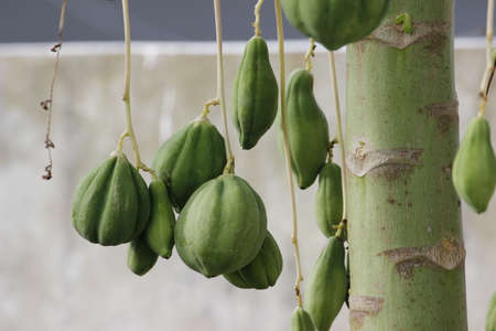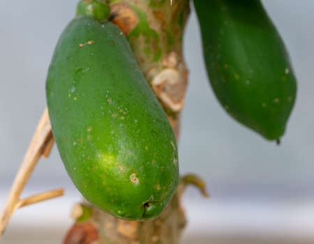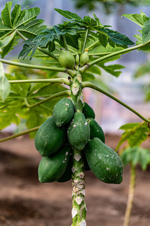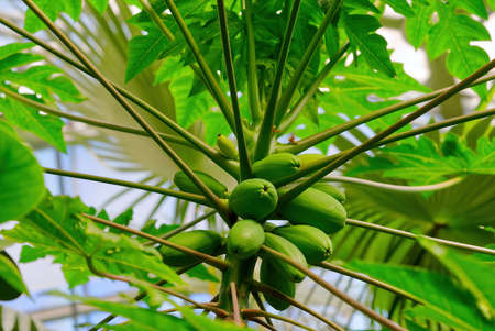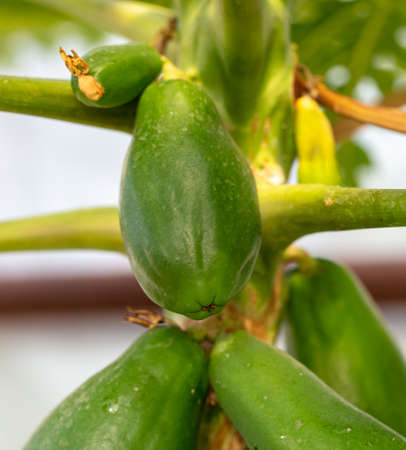 Papaya Fruits of Papaya tree in Botanic garden in Estonia. Fresh green papaya on tree with fruits close up