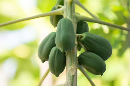 Green Papayas Fruit Growing on Tree Branch in Natural Tropical Light
