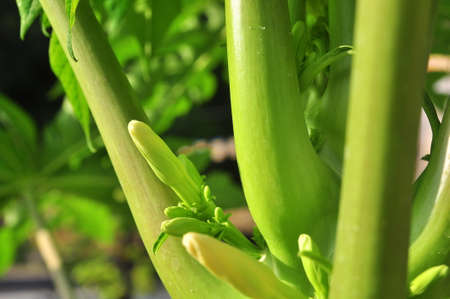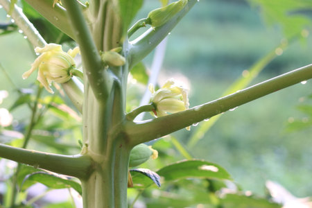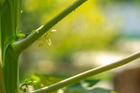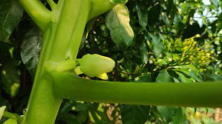 Closeup of papaya flower and bud on a tree in Indonesia. Papaya is one of the tropical fruits grown widely in Indonesia throughout the year
