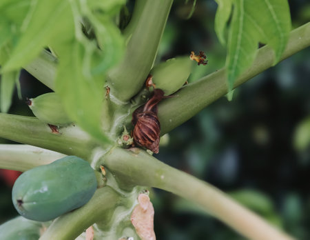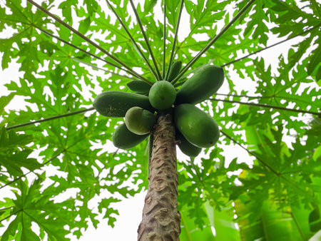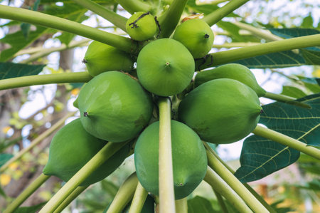Harvesting green papayas from a tropical garden nature photography lush environment close-up view sustainable agriculture
